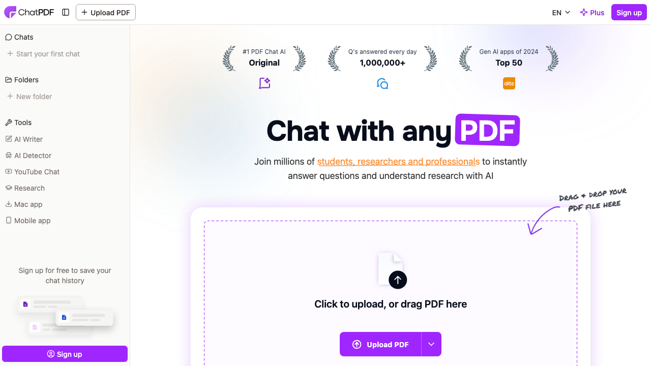 ChatPDF is an AI document interaction platform that allows users to upload PDF files and ask questions about their content through conversational AI. Reading lengthy PDF documents to find specific information, extract data, or understand complex content requires significant time and manual effort. For research, analysis, contract review, and knowledge work involving multiple PDFs, manual document review becomes prohibitively time-consuming. ChatPDF accelerates document interaction by enabling you to upload PDFs and simply ask questions about their content. The AI reads and analyzes the documents, providing direct answers with citations showing where information came from. This conversational approach transforms document interaction from passive reading into active question-answering, dramatically reducing time spent searching through PDFs for specific information. Whether you're reviewing contracts, analyzing research papers, extracting data from reports, or studying educational materials, ChatPDF makes document content immediately accessible through natural conversation.