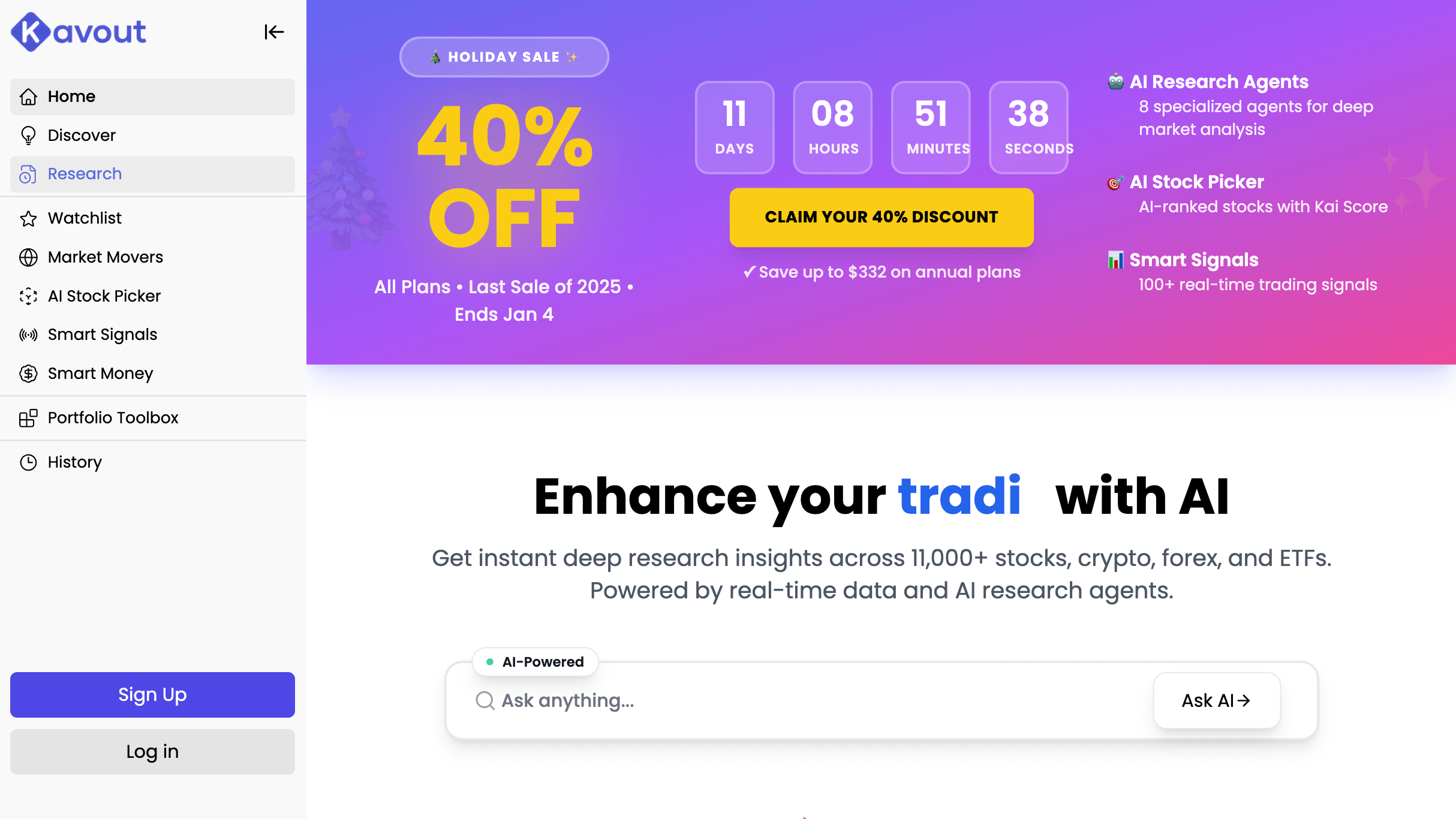 Kavout is an AI-powered financial research platform that deploys specialized research agents to analyze 11,000+ stocks, ETFs, cryptocurrencies, and forex pairs in seconds, turning real-time market data into instant, actionable investment insights. Unlike traditional investing tools that require manual research across multiple platforms, chart analysis, and reading countless analyst reports, Kavout's six AI research agents work autonomously 24/7 to monitor markets, analyze fundamentals, track technical indicators, and spot high-probability trading opportunities. The platform addresses the core challenges retail investors face: data overload from mountains of signals and news, emotional trading driven by FOMO and panic, the speed gap between retail and institutional investors, and the resource inequality where individuals lack Wall Street's analytical infrastructure. Founded in Seattle and recognized as a Top 5 AI Company at NVIDIA GTC, Kavout has become essential for individual investors who want institutional-grade research without hiring analysts or spending hours on manual market analysis.