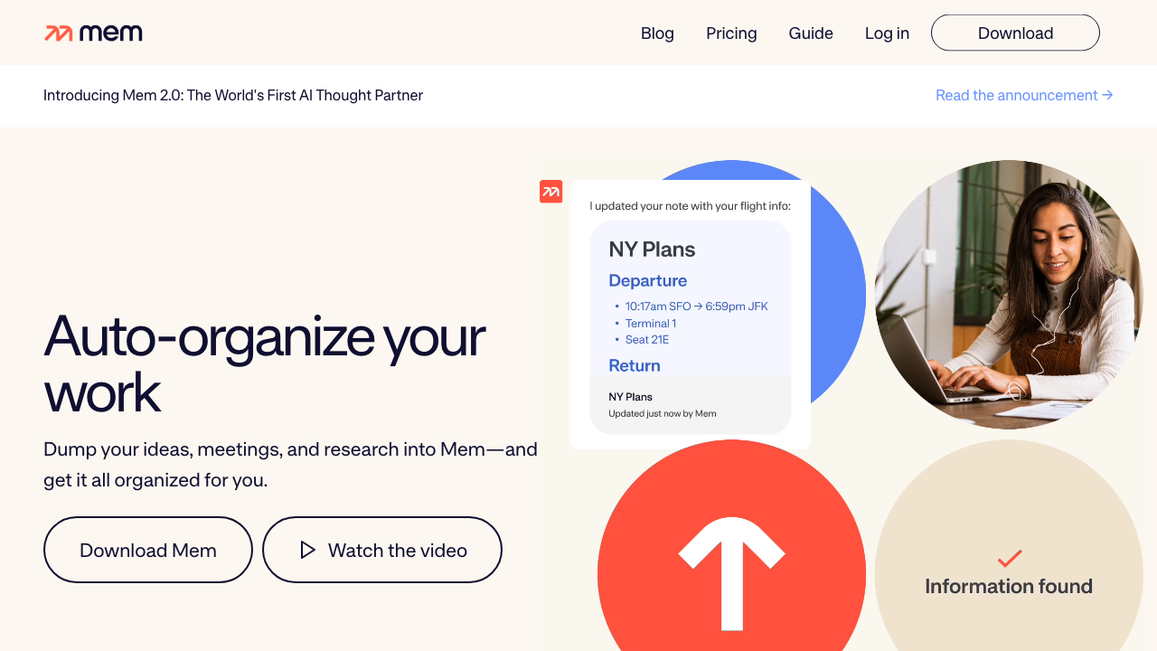 Mem serves knowledge workers capturing and organizing vast amounts of information-researchers, writers, learners, and professionals. Students building personal knowledge bases and study materials. Journalists and researchers organizing information from multiple sources. Anyone frustrated by rigid note-taking tools that don't help discover and connect ideas benefits from Mem's AI-augmented knowledge management.